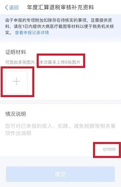 在【证明材料】点击“+”进行图片上传,单次最多可上传5张;在【情况说明】可对申报的收入、扣除减免税额等相关事项作出说明,字数不能超过1000字。