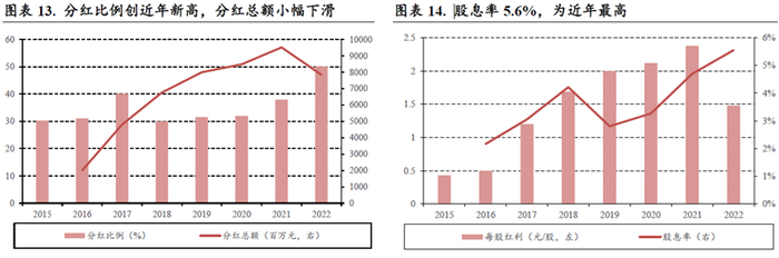 根据公司公告,公司拟向全体股东每股派发现金红利1.48 元人民币(含税),合计拟派发现金红利总额78.43 亿元人民币(含税),拟分红额占2022 年公司归母净利润的50.08%,股息率约5.6%。回顾公司今年分红情况,50%以上的分红比例为近年最高,在利润与公司市值均下挫的情况下,分红总额下降幅度较小。按照历史年度市值计算,2022 年的股息率约5.6%,为近年最高。