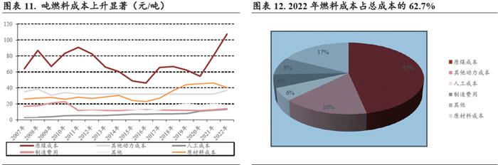 2022 年,煤炭价格持续高位,进一步拉高了公司的成本。根据公司年报,公司吨燃料动力已涨至144.54 元/吨,同比上升31.8 元/吨,占公司成本比例达62.7%,是公司成本上升的最核心原因。我们估算原煤成本占比已接近50%。