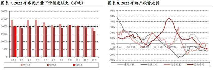 根据国家统计局,2022 年地产新开工12.06亿平方米,下降39.4%;施工面积90.50 亿平方米,同降7.2%;拿地面积1.01 亿平方米,同比下降53.4%;全国房地产开发投资13.29 万亿元,同比下降10.0%。全国水泥产量21.18 亿吨,同比下降10.8%,产量降幅较大。