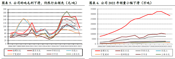 公司2022 年全年实现收入1320.22 亿元,同降21.40% ;归母净利156.61 亿元,同降52.92%。根据公司年报,2022 年公司实现自产水泥及熟料销量2.83 亿吨,同降6.94%。机构测算公司全年水泥均价320.9 元/吨左右,根据年报,公司吨成本230.4 元/吨,同比上升26.66 元/吨,我们测算吨毛利90.5 元/吨,同降66.5 元/吨;吨净利57.1 元/吨,同降55.1元/吨;水泥及熟料毛利率28.2%,同比下降15.4pct;水泥销售净利率12.2%,同比下降8.1pct。