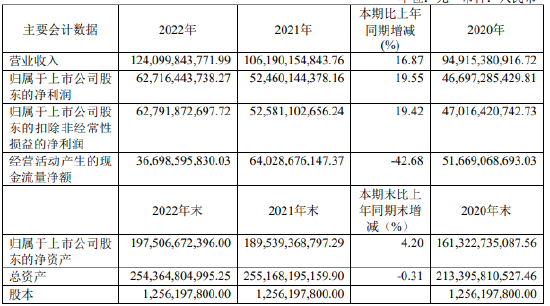 贵州茅台2022年年报显示,公司实现营业总收入1275.54亿元,同比增长16.53%;归属于母公司所有者净利润627.16亿元,同比增长19.55%,日赚1.72亿元;基本每股收益49.93元;公司拟每10股派发现金红利259.11元(含税),合计拟分红325亿元,约为去年净利润的51.8%,再次刷新公司上市以来的分红纪录。