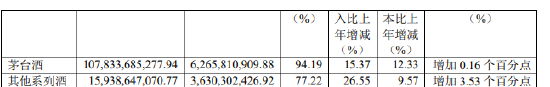 茅台系列酒实现营业收入159.39亿元,同比增长26.55%。营业成本36.30亿元。同比增长9.57%。毛利率为77.22%,同比增加3.53个百分点。系列酒包括“茅台王子酒”、“茅台1935酒”、汉酱酒和赖茅酒。