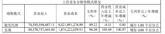 按销售渠道看,直销渠道营收493.79亿元,同比大增105.49%,毛利率达96.20%。批发代理渠道743.94亿元,同比降9.31%,毛利率为89.22%。截至2022年底,国内经销商数量2084家,较2021年末减少5家。