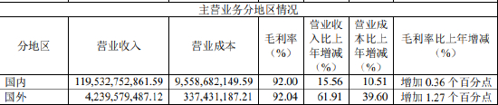 分地区来看,公司在国内实现营业收入1195.33亿元,同比增长15.56%。营业成本为95.59亿元,同比增长10.51%。毛利率为92.00%,同比增加0.36个百分点。