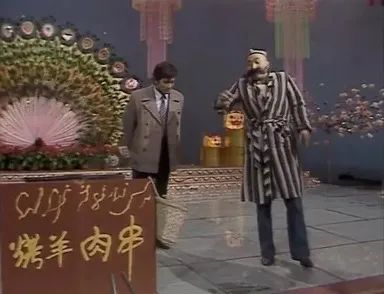 陈佩斯穿个袍子、贴上胡子,脑袋上扣个新疆特色的小帽儿,再卷着舌头一喊:“烤好了,烤好了,新疆乌鲁木齐羊肉串!”