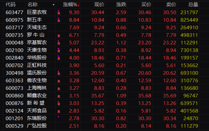 概念板块方面,猪肉概念板块再度大涨,板块盘中涨幅超过3%,新五丰盘中一度触及涨停,截至上午收盘,涨幅8.84%。此前一个交易日,该股涨停。巨星农牧上午盘中一度触及涨停,截至上午收盘,涨9.30%。此前一个交易日该股大涨6.66%。天域生态、罗牛山等多股盘中涨幅超过5%,天康生物、温氏股份、新希望等涨幅超过3%。