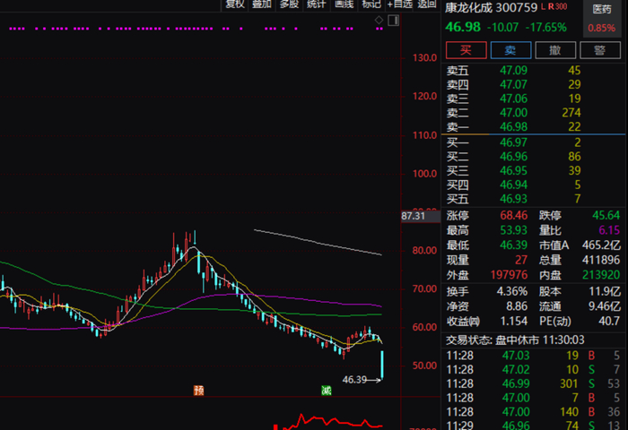 其他个股方面,康龙化成上午盘中股价暴跌17.65%,盘中一度跌逾18%。