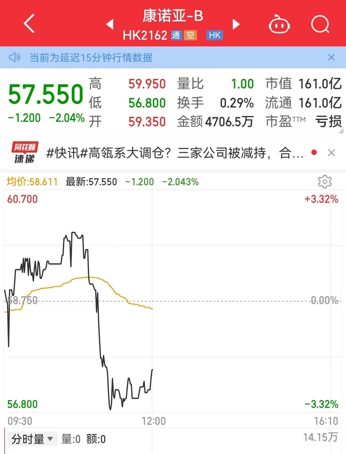 截至3月31日午盘,康诺亚-B报57.55港元,跌幅2.04%,市值161亿港元。