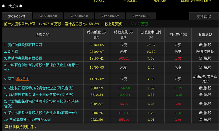 去年第四季度,高瓴投资减持了宁德时代564.84万股股份。在此之前,2022年第一季度,高瓴投资已经减持过一轮,当时减持了宁德时代376.5万股。全年合计减持超过941万股。