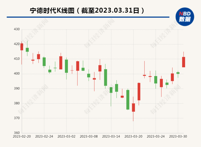 截至3月31日午盘,宁德时代报411.30元/股,涨幅2.80%,市值1.0万亿元。