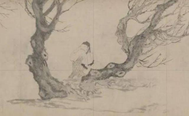 这是弘治十六年,唐寅三十三岁的时候,他画了《风木图》。画上一位文士以袖掩面,坐在两棵枯木之间,狂风怒号,枝桠被吹得歪向一侧,文士也蜷着身体,正瑟瑟发抖,面色凄惶。