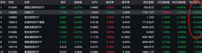 此外,上面图表未将跨境ETF统计在内。如果加上跨境ETF的话,港股生物科技ETF、恒生医药ETF等今年都下跌超过10%。