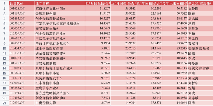 此外,在本月股票“牛基”TOP20榜单中,看到了熟悉的顶流杨锐文,他管理的景顺长城电子信息产业取得了18.61%的收益,排名第13位。 去年,该产品表现不佳,亏损了超过30%,杨锐文也在刚刚披露的年报中向投资者致歉。而今年,杨锐文总算苦尽甘来。
