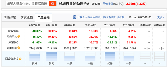 2021年,长城行业轮动是最辉煌的一年,当年取得80%以上的收益,排名同类第七。但从去年开始,产品净值回撤明显,去年损失10%,今年前三个月,又损失13%。