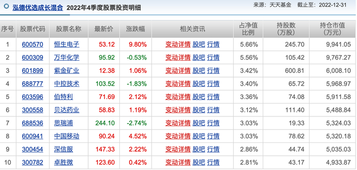截至三月末,王克玉管理的泓德优选成长取得了12.6%的收益,目前表现领先。王克玉专注具备核心竞争力的公司。王克玉在刚刚公布的年报中表示,在2022年下半年我们看到越来越多的上市公司推出回购、提高分红比例等方案,成为稳定市场的重要力量,有效地降低了市场的波动。而去年第四季度,王克玉买入了中国移动,因此在今年获得了一波“中特估”带来的福利。