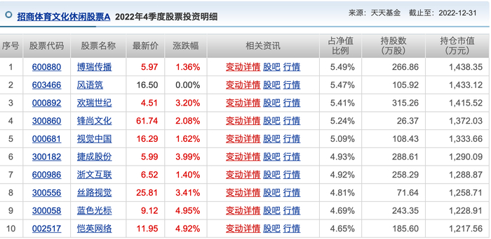 具体来看,招商体育文化休闲重仓股主要持有文化传媒板块个股,其中,蓝色光标、恺英网络等3月以来涨幅巨大。