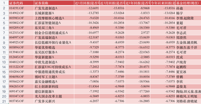 此外,长城新能源、上投摩根核心精选、汇添富智能制造,今年以来亏损都超过10%。