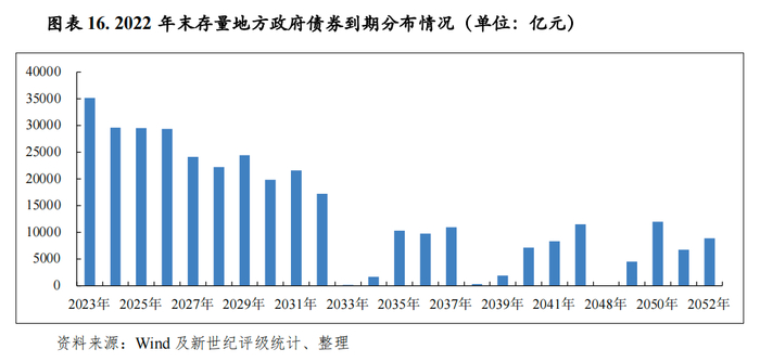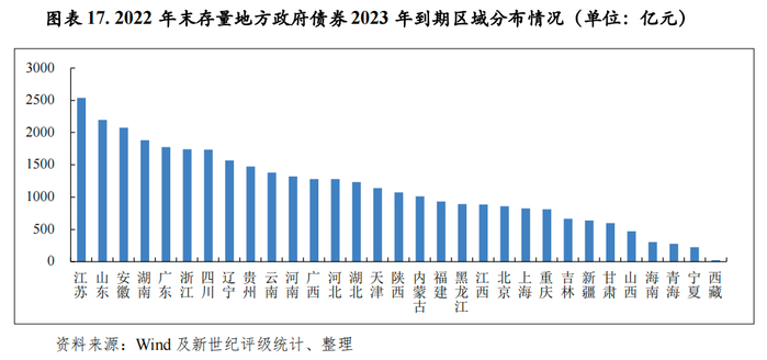 从到期分布看,2022年末存量地方政府债券到期分布集中于未来十年,到期债券偿还本金年均规模为2.53万亿元。从2032年到期区域分布看,江苏省、山东省(含青岛市)、安徽省、湖南省、广东省(含深圳市)、浙江省(含宁波市)、四川省、辽宁省(含大连市)和贵州省等17个地区到期地方政府债券本金规模较大,均超过千亿元,上述地区2023年到期地方政府债券本金合计2.67万亿元。