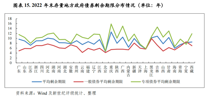 从剩余期限分布看,2022年末存量地方政府债券平均剩余期限为8.66年,较上年末提高0.84年,其中一般债券平均剩余期限为6.26年,专项债券平均剩余期限为10.31年,2014年度发行的未分品种地方政府债券平均剩余期限为1.60年,剩余期限较短。从各地区情况看,2022年末,北京市、上海市、海南省和内蒙古自治区存续地方政府债券平均剩余期限较短,均低于6.5年;河北省、黑龙江省、甘肃省、广西省、吉林省和重庆市存续地方政府债券平均剩余期限较长,均高于10.0年,其中重庆市受当年发债期限大幅拉长影响,平均剩余期限达12.61年;其余地区存续地方政府债券平均剩余期限均处于7.0年至10.0年之间。