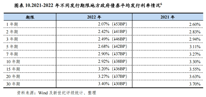 2022年,我国货币市场保持灵活适度,市场流动性合理充裕,债券收益率中枢下移。当年,地方政府债券平均发行利率较上年下降34BP至3.02%,平均发行利差较上年下降16BP至14.15BP。从不同发行期限债券来看,2022年各期限债券平均发行利率较上年均有所下降,最高降幅达53BP。