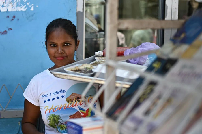 3月26日,一名女子在洪都拉斯首都特古西加尔巴的一处街道上售卖小吃。