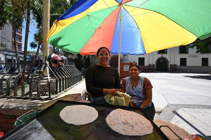 3月26日,在洪都拉斯首都特古西加尔巴,两名女子制作当地特色的“巴莱达饼”。