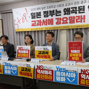 ▲3月28日,韩国首尔,活动人士举行紧急新闻发布会,批评日本批准新小学教科书的修改。