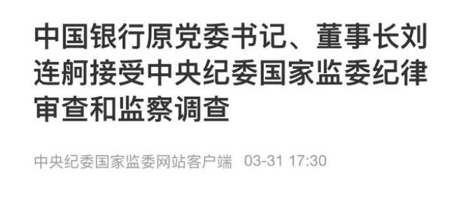 “ 中国银行原党委书记、董事长刘连舸涉嫌严重违纪违法,目前正接受中央纪委国家监委纪律审查和监察调查。”