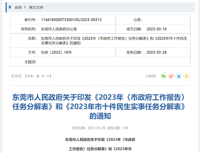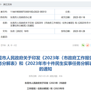 近日,东莞市人民政府印发《2023年〈市政府工作报告〉任务分解表》和《2023年市十件民生实事任务分解表》。