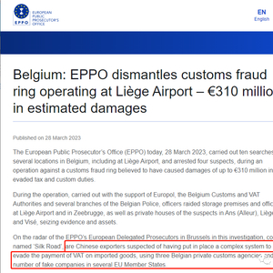 EPPO驻布鲁塞尔的欧洲代表检察官在这项代号为“丝绸之路”的调查中注意到,中国出口商涉嫌利用三家比利时私人海关机构和几个欧盟成员国的一些假冒公司来逃避进口商品的增值税。