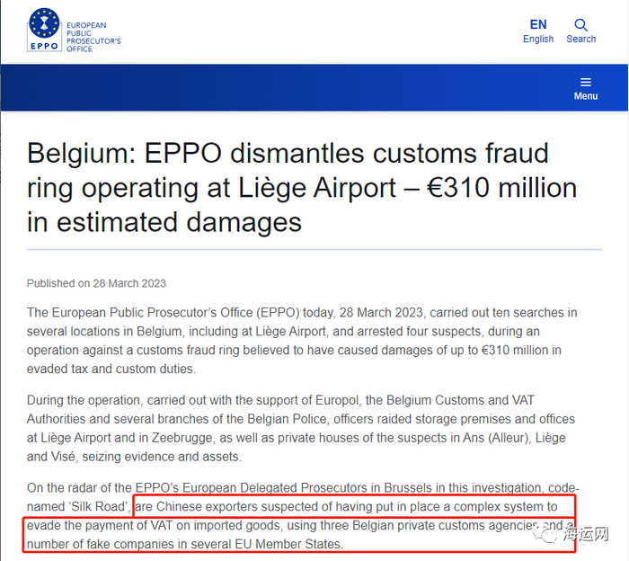 此次比利时大规模搜查的事件并不是毫无预兆,之前EPPO就针对清关行进行过清查,代理被追缴税款的事件。最典型的就是去年被称为欧盟有史以来最大的22亿欧元的国际税务欺诈行为。
