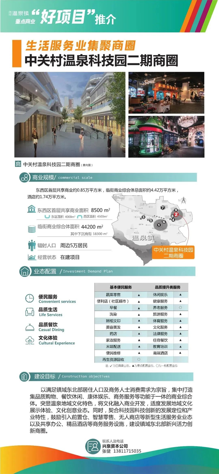 中关村温泉科技园二期商圈正在建设中,商业总面积约7万余平方米。东区预计今年6月竣工交付使用。西区预计2024年12月竣工交付使用。该商圈将打造成为集品质购物、餐饮休闲、康体娱乐、商务服务等功能于一体的商业综合体,成为镇域东北部新兴活力创新商圈。