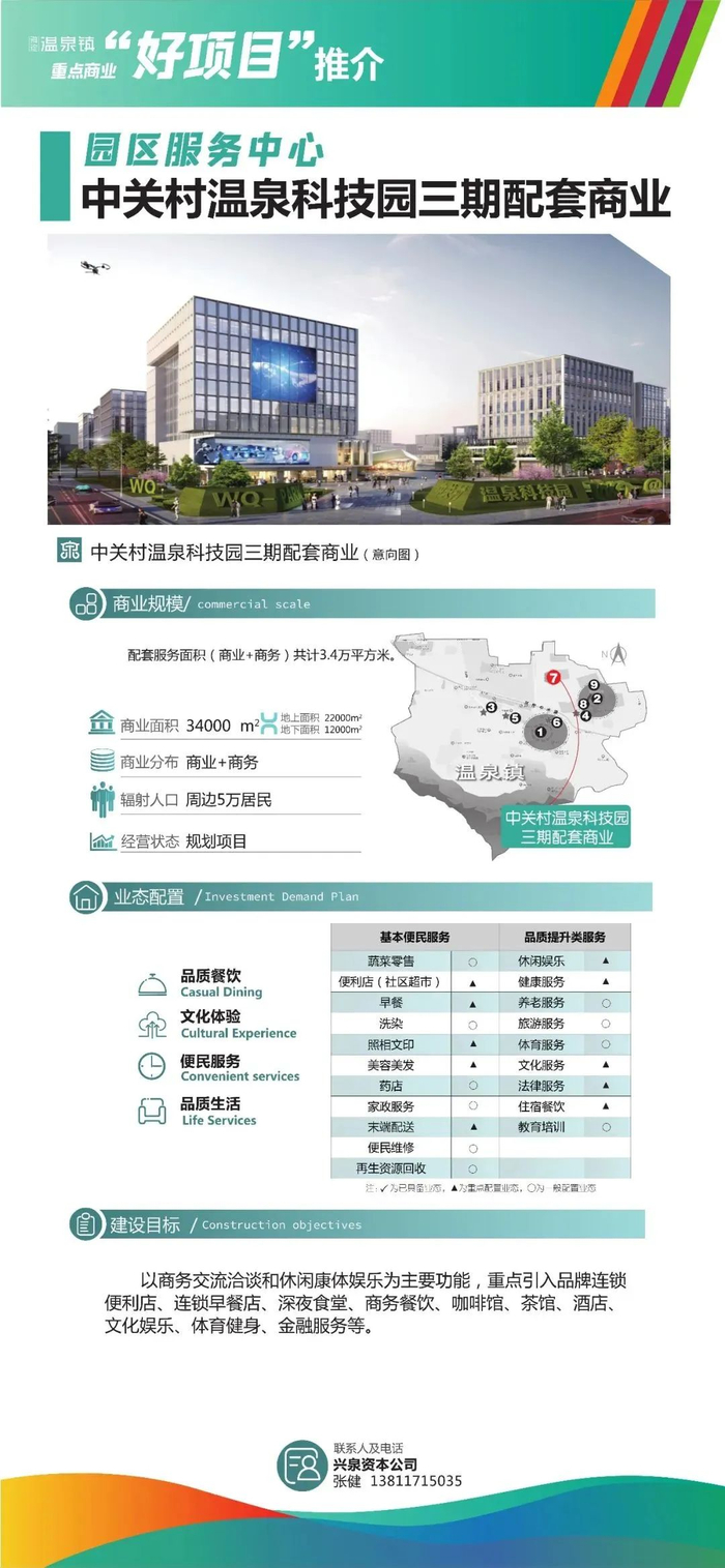 中关村温泉科技园三期商业面积约3.4万平方米,以商务交流洽谈和休闲娱乐为主要功能,着重引入品牌连锁便利店、连锁早餐店、深夜食堂,商务餐饮、咖啡馆、茶馆、酒店、文化娱乐、体育健身、金融服务等,预计2025年完工。