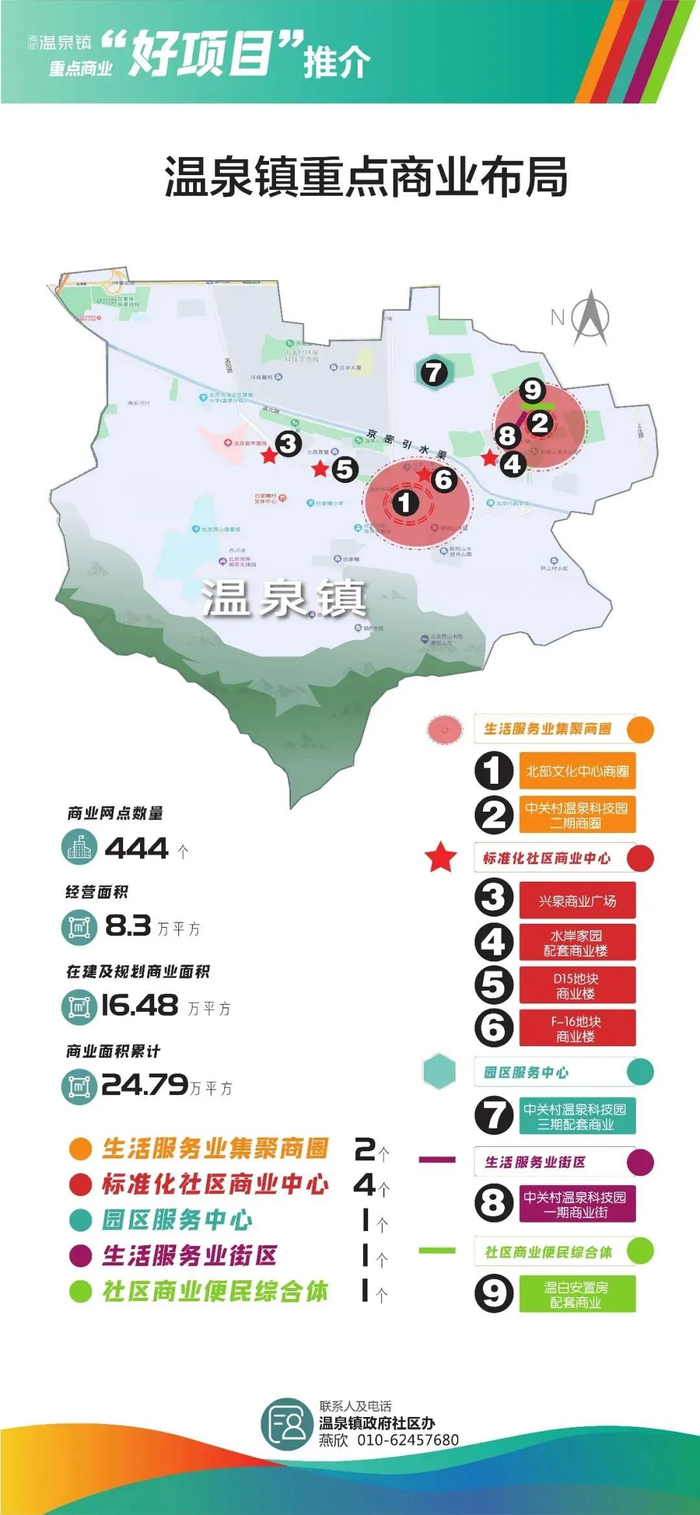 根据《温泉镇生活服务业发展三年行动计划》,未来温泉镇将统筹约24万平方米商业面积。其中全镇生活服务业网点444个,总经营面积约8万平方米;在建及规划商业面积约16万平方米,重点打造中关村温泉科技园三期地块、温白安置房地块、中关村温泉科技园二期、中关村温泉科技园一期商业街、水岸家园配套商业楼、F16地块、北部文化中心商圈、D15地块及兴泉商业广场9个商业项目。