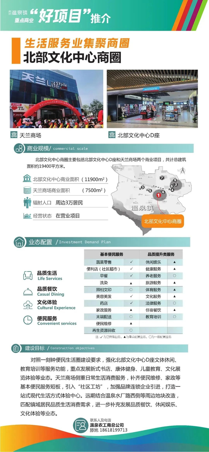 北部文化中心商圈主要包括北部文化中心D座和天兰商场两个商业项目。北部文化中心D座总建筑面积约1.19万平方米,天兰商场总建筑面积约0.75万平方米。未来温泉镇将对照一刻钟便民生活圈建设要求,将北部文化中心商圈打造成高品质生活服务业聚集的传统商圈。