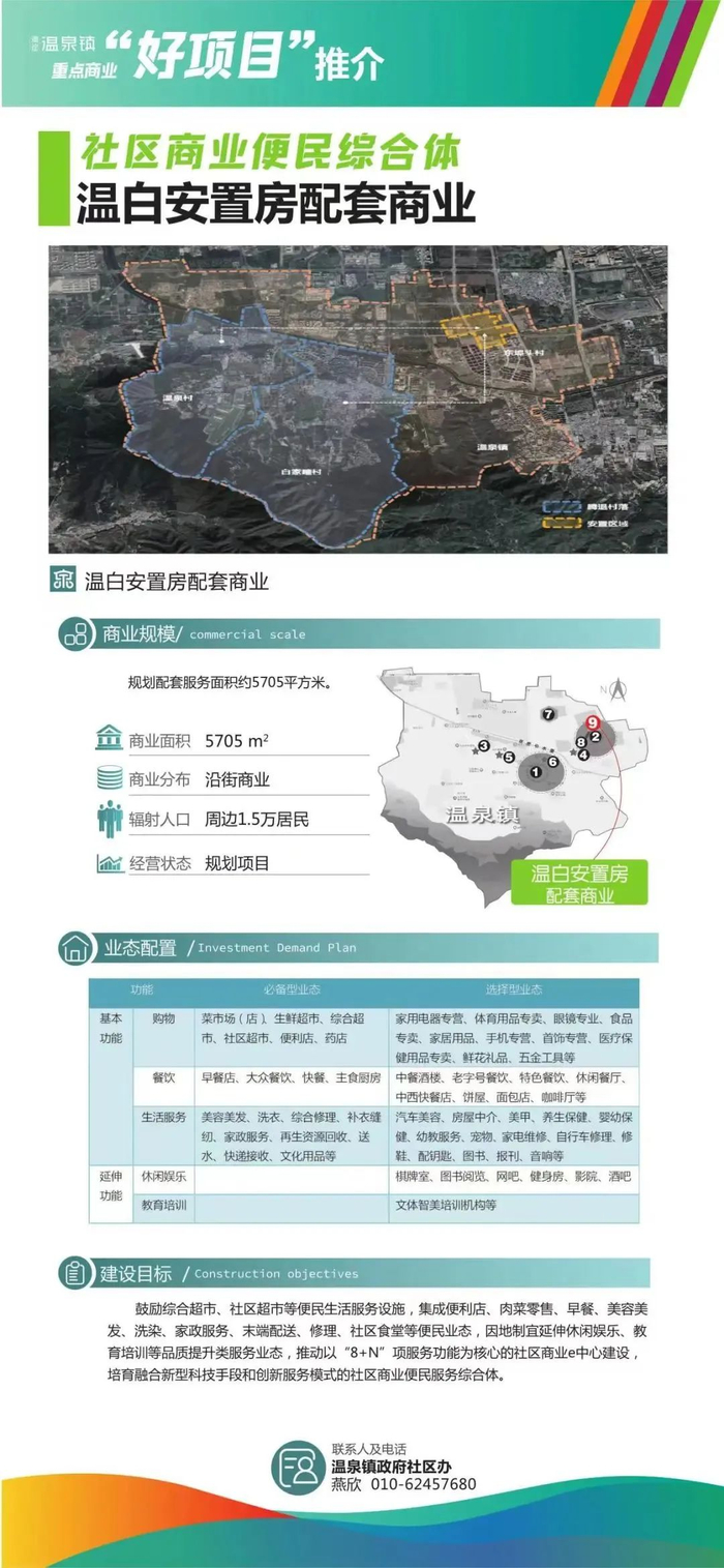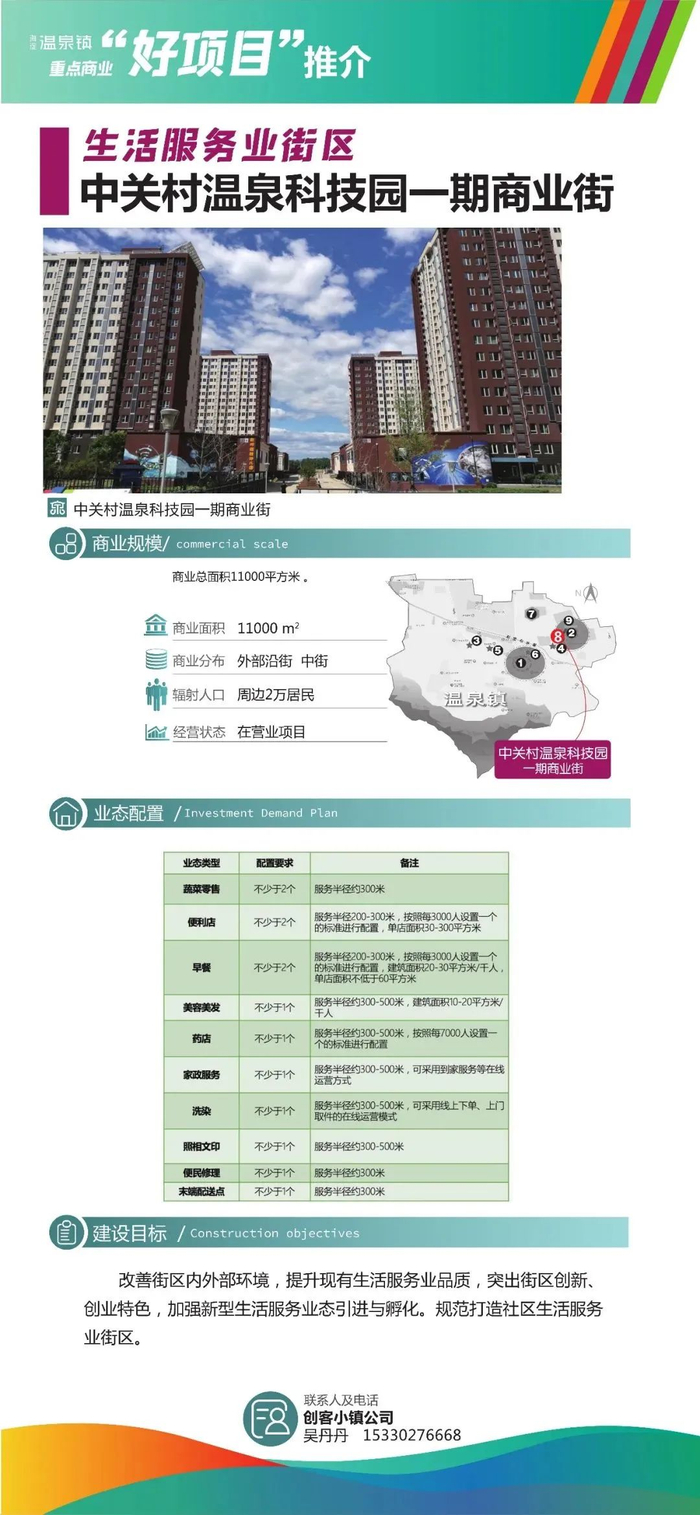 中关村温泉科技园一期商业面积约1.1万平方米,将改善街区内外部环境,提升现有生活服务业品质,突出街区创新创业特色,加强新型生活服务业态引进与孵化,规范打造社区生活服务业街区。