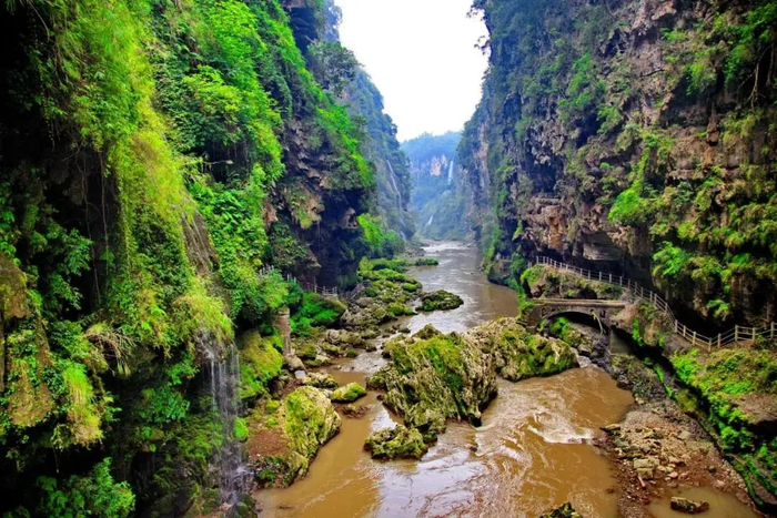 马岭河峡谷是亿年前地壳运动的神力将地面拉开的一条地缝,在水流长期侵蚀下形成了一条奇险幽深的狭窄峡谷。马岭河峡谷约有200至400米深,最窄处仅50米,人们称之为“地球上美丽的伤疤”。