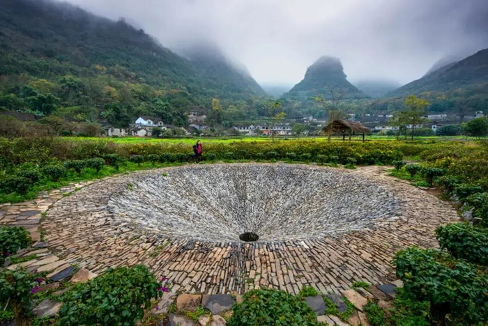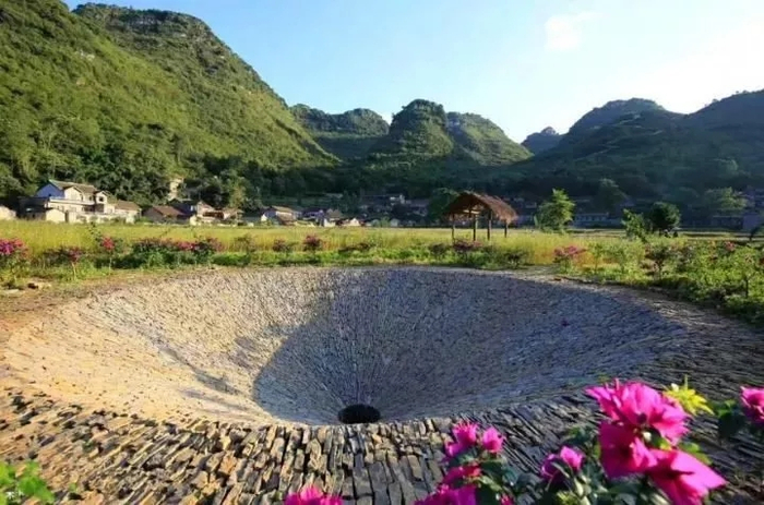 天坑地漏是中央美术学院学生的作品,除了观赏的作用外还具有排水功能。这件作品直接使用“漏斗”这一概念,将“消水洞”洞口放大呈漏斗状,以此来强化自然地质的特点。“漏斗”表层采用当地青石呈放射状铺砌,带给人一种强烈的空间感。