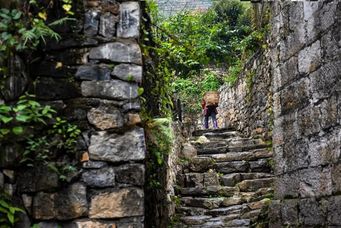 寨中巷道环环相扣,道道相通,按九宫八卦形排列,寨内古树参天,石板路上青苔遍生,幽静曲折。