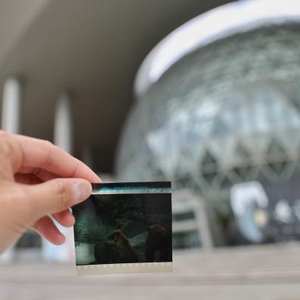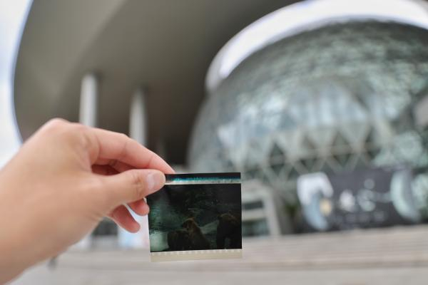 在影院门口,等待入场的观众都拿到了最后一场巨幕电影和球幕电影的纪念品——装有一张科普电影胶片的亚克力盒子。记者拿到的是金丝猴在树上栖息的胶片,估计是来自上海科技馆制作的“中国珍稀物种”系列纪录片《川金丝猴》。这些胶片记录了科技馆“科学影城”的历史,很有纪念价值。