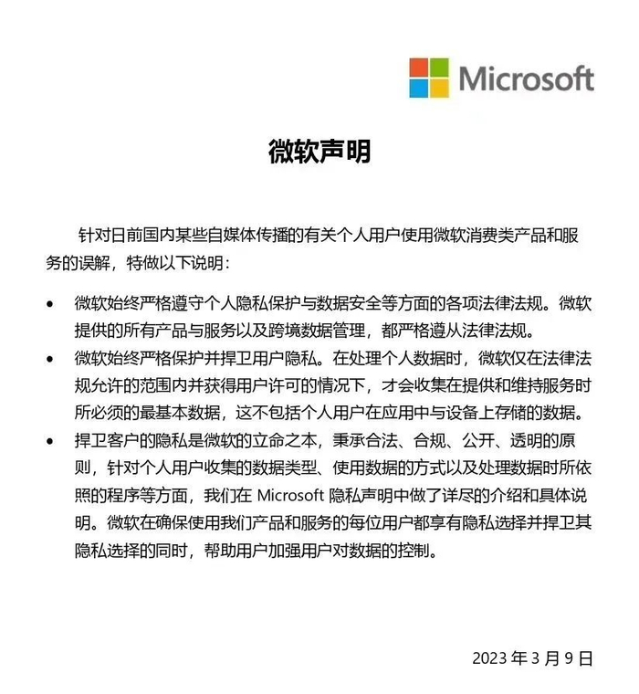 3月9日,微软中国发布声明,表示微软始终严格遵守个人隐私保护与数据安全等方面的各项法律法规。微软提供的所有产品与服务以及跨境数据管理,都严格遵从法律法规。在处理个人数据时,微软仅在法律法规允许的范围内并获得用户许可的情况下,才会收集在提供和维持服务时所必须的最基本数据,这不包括个人用户在应用中与设备上存储的数据。
