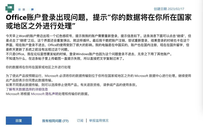 2月17日,一名用户在微软官网的用户社区中发帖称,自己的Office账户登录出现问题,在登录时弹出提醒:“Microsoft可能会将你的个人数据传输至中国以外的地区,以便为你提供此产品和服务以及其他Microsoft产品和服务。”点击“继续”后该界面还会重复弹出,并持续循环。
