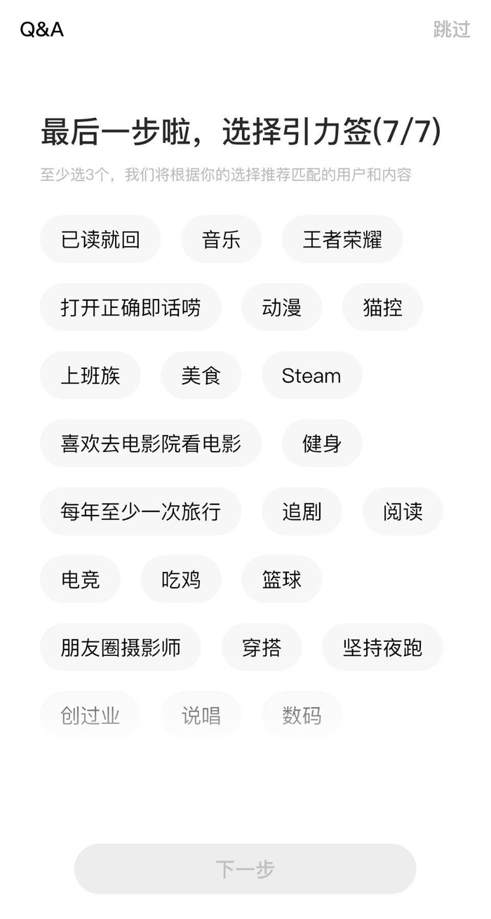 在最初使用Soul时,平台会对用户进行一系列的测试,而后让用户选择自己的兴趣领域,而这些操作的逻辑便是为用户打上属性“标签”,再以标签为基准经过一定的算法计算与其他用户间的匹配度,以此为依据为用户推荐适合成为好友的人。
