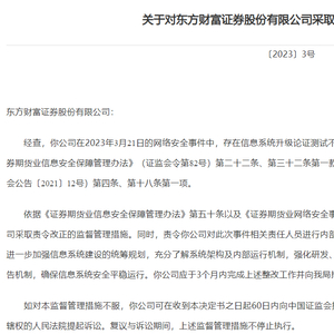 当中指出,经查,东方财富证券在2023年3月21日的网络安全事件中,存在信息系统升级论证测试不充分、未及时报告网络安全事件的问题。上述行为违反了《证券期货业信息安全保障管理办法》(证监会令第82号)第二十二条、第三十二条第一款以及《证券期货业网络安全事件报告与调查处理办法》(证监会公告〔2021〕12号)第四条、第十八条第一项。