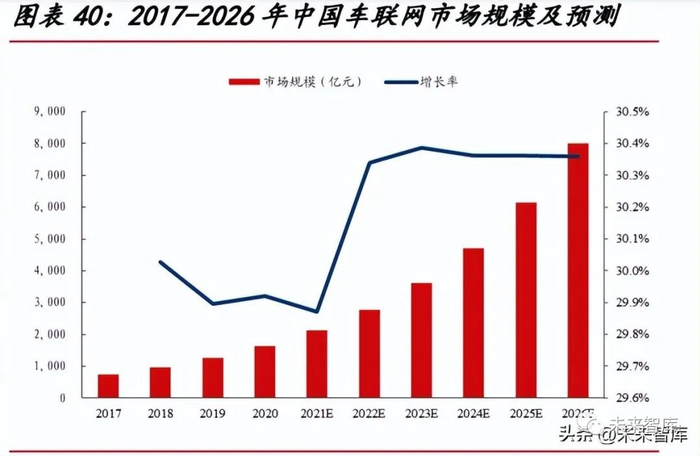 全球智能网联新车渗透率快速提升,中国市场处于领先地位。根据 HISMarkit 统 计,2018 年,全球智能网联新车渗透率为 30.7%,预计 2025 年达 59.4%,年均提 升 3.59pct;中国市场智能网联新车渗透率为 24.9%,预计 2025 年达 75.9%,年均 提升 6.38pct,超过同期全球水平。中国车联网市场空间广阔,行业规模快速增长。据中商产业研究院统计,我国车 联网市场规模从 2017 年的 746 亿元,增加至 2021 年的 2126 亿元,预计 2022 年 将达到 2771 亿元的水平。2017-2022 年,CAGR 达 30%。