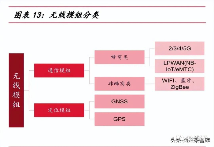 功能上无线模组分为通信模组和定位模组。通信模组包含蜂窝类与非蜂窝类模组, 蜂窝类模组又可细分为 2/3/4/5G 模组、用于物联网设备的低功率广域网(LPWAN) 模组;非蜂窝类模组包含 WiFi、蓝牙、ZigBee 模块。定位模组是以卫星定位为主的 通信模块,负责卫星信号采集和数据传输作用。根据通信速率,可以将通信模组划分为 4 个应用场景:无源物联、窄带物联、中 低速物联和高速物联。无源物联指的是物联网终端节点设备不含有电源,主要以物流、 仓储需求为主,连接数达近千亿规模。窄带物联专门为大连接数、小数据量的物联网 应用场景准备,其具有低功耗、速率低的特点,主要在智能水表和环境监测方面应用, 连接量达到百亿级别。中低速物联对传输速度和响应时间有一定的要求,对成本性能 比要求较高,非常适合零售和家用场景使用,连接量可以达到十亿级别。高速物联对 通信技术的要求极高,具备快接入、高稳定、高并发的特点,多在自动驾驶和工业互 联网领域应用。