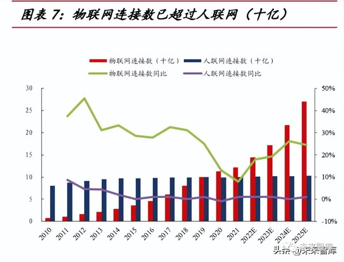2010 年以来,全球物联网连接数长期处于高速增长阶段,全球物联网连接数每 年同比增速远超同期人联网连接数。2010-2019 年,物联网连接数每年同比增速处于 25%-45%之间,人联网连接数在 2015 年之后基本处于稳定不增长状态。据 loTAnalytics 预测,2022 年度全球物联网连接数将重回高速增长轨道,2025 年全球 IoT 连接数将较 2021 年增长 121%,2021-2025 年 CAGR 达 22%。全球消费电子出货量步入增速平稳阶段,智能手机、笔记本和平板增速趋近于 0。据 Counterpoint 和 IDC 统计,2021 年度智能手机、笔记本、平板三者增速分别为 4.58%、4.85%、3.24%。自 2012 年以来,笔记本出货量稳中有升,智能手机、平板 出货量增速逐年下降,部分年份出现负增长。其中 2020 年受疫情因素的影响,笔记 本设备需求激增,同比增速超 30%。中长期来看,传统消费电子市场出货量或已见 顶,预计未来处于个位数增长区间。