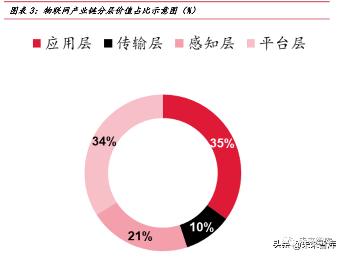 根据中商情报网,引用麦肯锡的报告数据,当前我国物联网行业中,应用层与平 台层占据了物联网产业链绝大部分价值,占比分别为 35%和 34%。感知层部分市场 空间也比较广阔,占全行业价值的 21%。传输层占比最小,仅为 10%。