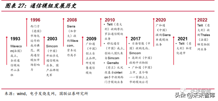 全球通信模组行业诞生于 1993 年,2003 年芯讯通(Simcom)作为首家中国厂 商步入通信模组领域。2010 年前后通信模组行业开始出现企业并购浪潮,但基本上 以资本运作为主。近 5 年来,通信模组行业内部整合再度加速。2017 年日海智能收 购龙尚、Simcom,高新兴收购中兴物联;2018 年广和通收购 Sierra 车载模块业务;2022 年意大利泰利(Telit)收购法国泰雷兹集团(Thales)蜂窝物联网业务。
